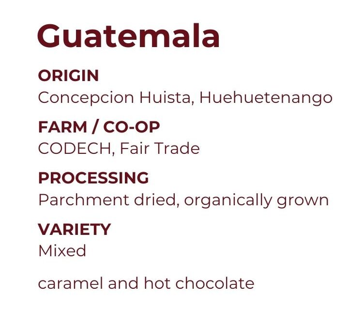 CODECH is an organization in Concepción Huista that brings together 10 member groups and 476 producers with a shared focus on sustainable development and community empowerment. With strong emphasis on organic farming, women’s participation, and farmer education, CODECH supports producers through workshops in agriculture, leadership, and commercialization while promoting independence from external inputs and volatile markets. Their work strengthens both coffee quality and long-term livelihoods in northern Huehuetenango.