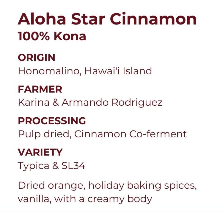 This limited Typica & SL 34 micro lot was co fermented with cinnamon bark for 24 hours in a sealed tank, then rinsed and dried in the pulp, a resourceful pulp dried process that reduces water usage and preserves vibrant fruit notes. The result is a sialky, aromatic cup that layers sweet cinnamon spice, gentle florals, and rich cocoa warmth. We’re constantly inspired by Karina, Armando, and Elias Rodriguez, who continue to elevate Hawai’i-grown coffee through their innovative, sustainable, and hands on approach. Since 2018, their work at Aloha Star Coffee Farm has been recognized among Kona’s finest producers, and this special release captures their spirit beautifully.